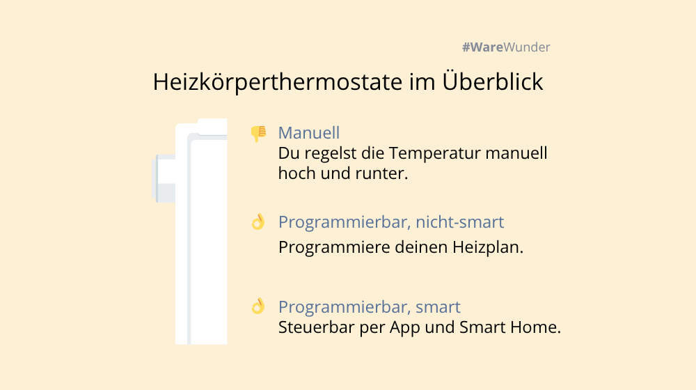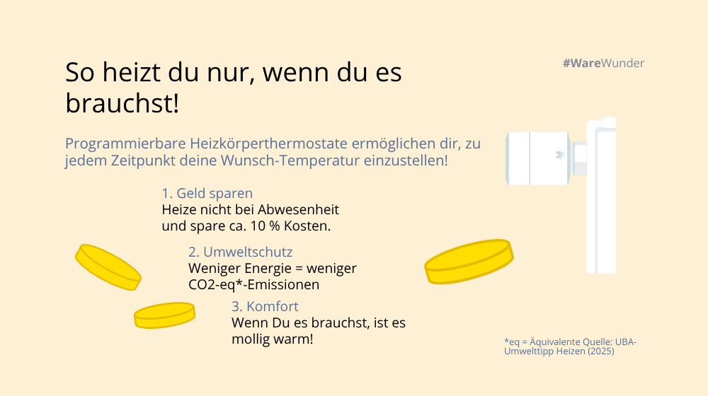 Wer tagsüber nicht zu Hause ist, braucht auch nicht ganzen Tag zu heizen. Programmierbare Thermostate ermöglichen es, trotzdem in eine warme Wohnung heim zu kommen. #WareWunder