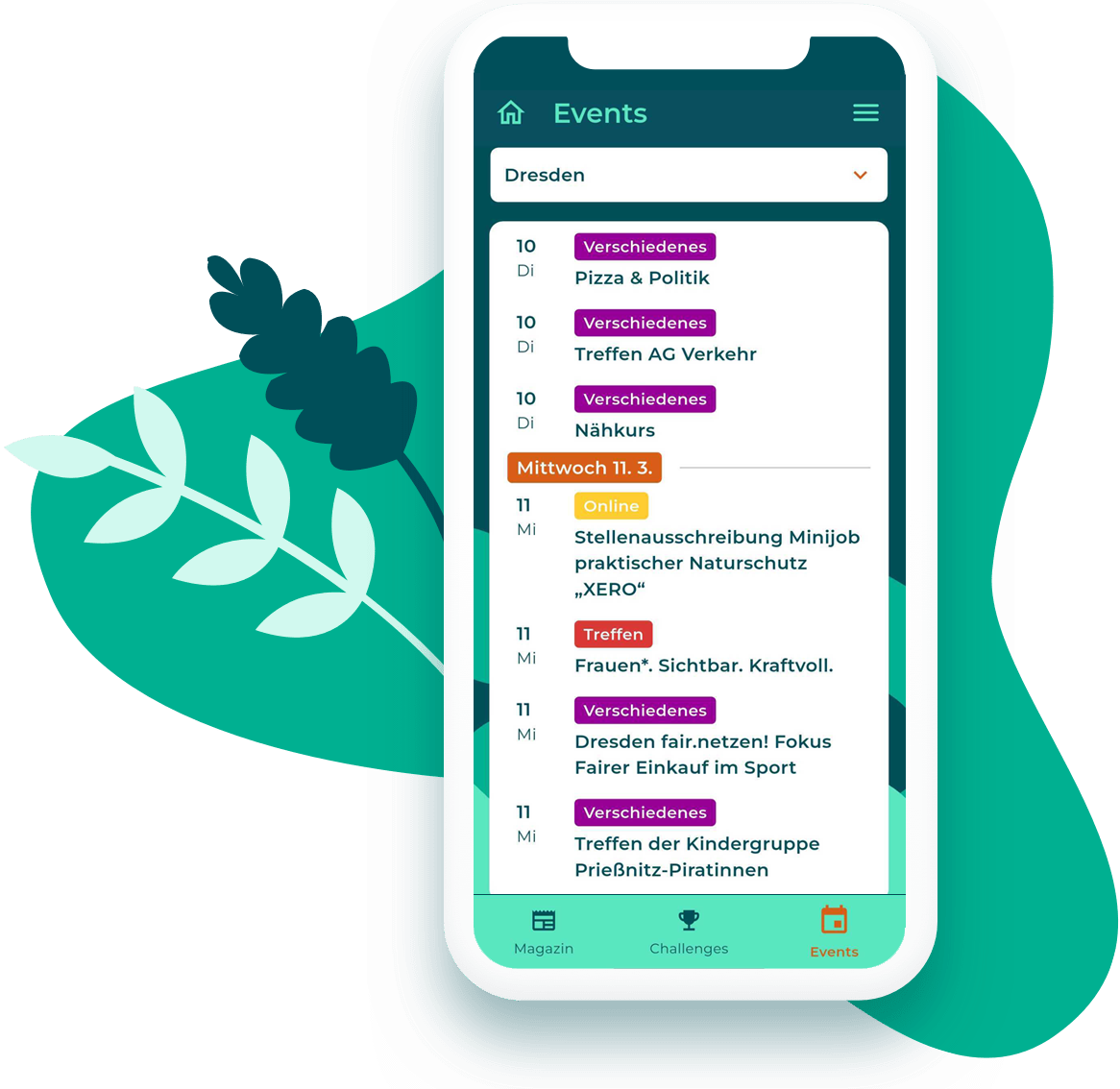 Du willst mal wieder Gras anfassen, oder suchst eine Community in deiner Gegend, die zu dir und deinen Interessen passt? In unserem Kalender findest du täglich spannende Events und Aktionen in deiner Region - präsentiert vom Grünen Brett des BUND Dresden und Input_DD.